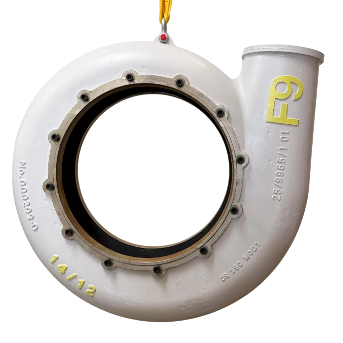 Volute and side liners in high-chrome alloy. All sizes for the F9-10 through F9-32 range.